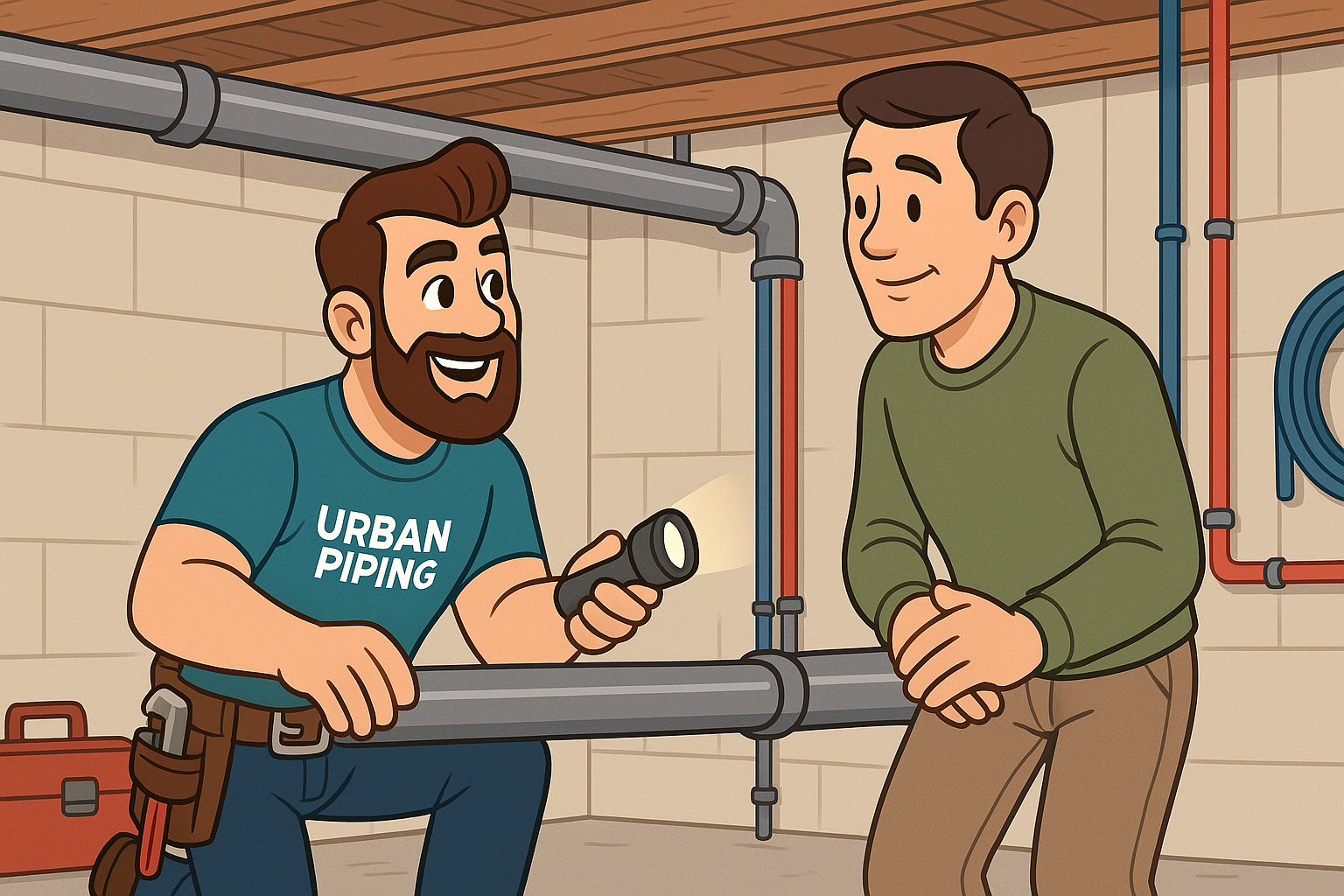 A professional from Urban Piping inspects basement poly b plumbing to meet CMHC guidelines in Canada’s major cities.