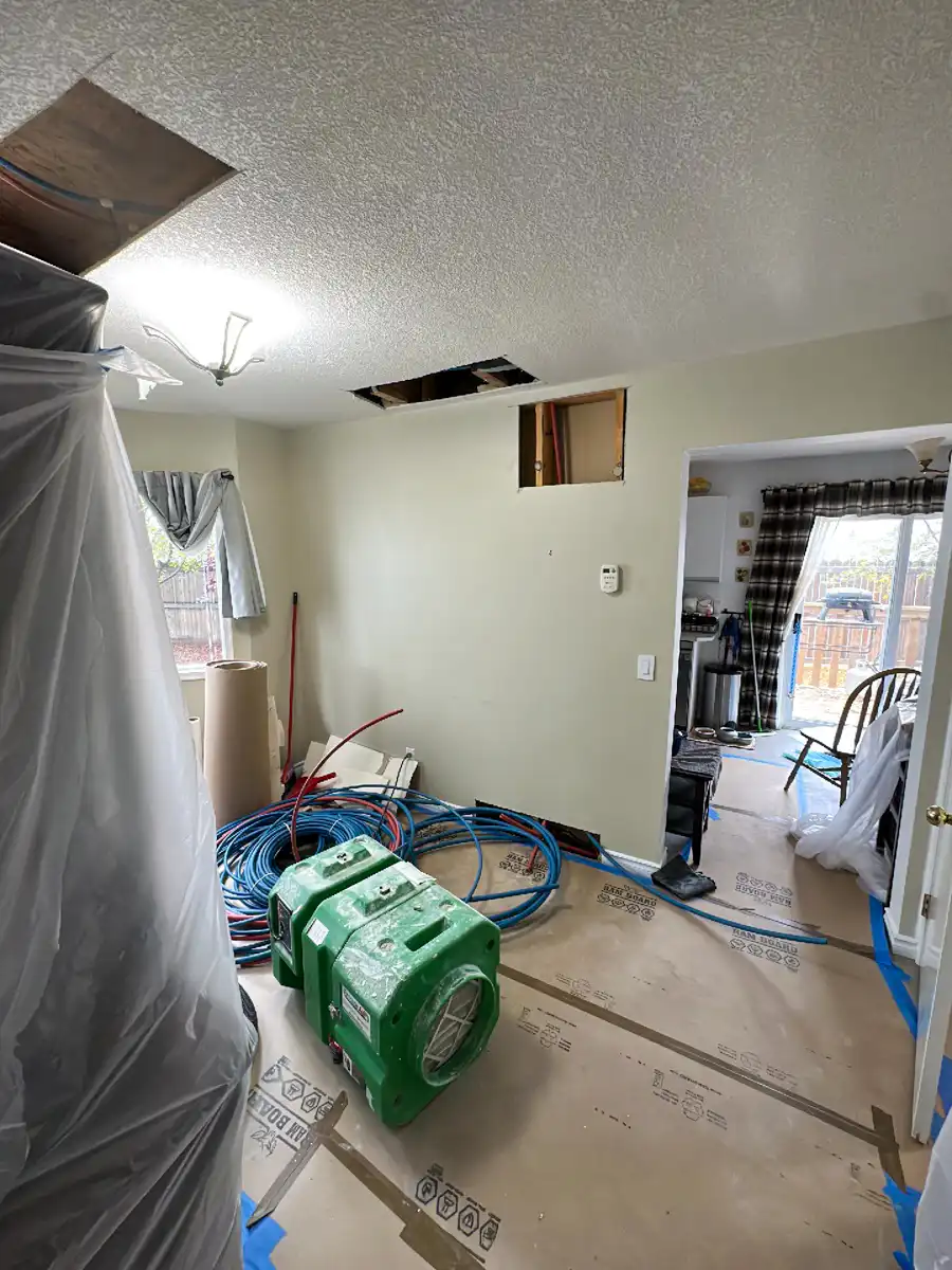 A professional-grade four-stage HEPA air scrubber ran throughout the project to maintain indoor air quality during the drywall work. The project wrapped up on October 13th—approximately twelve days from start to finish—with a thorough cleanup that removed all prep materials and debris, followed by vacuuming and wiping down the entire home.