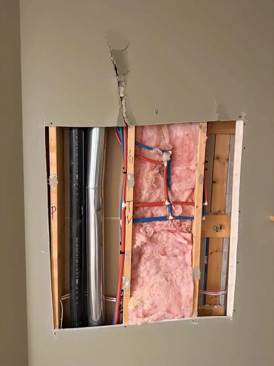 With pipes running throughout the home’s multiple levels and finished spaces, the team cut access points in the drywall at numerous locations. Once the new piping was installed and pressure-tested, the drywall repair phase began. This included boarding, mudding, taping, and texture matching to ensure repairs blended seamlessly with existing ceilings and walls.