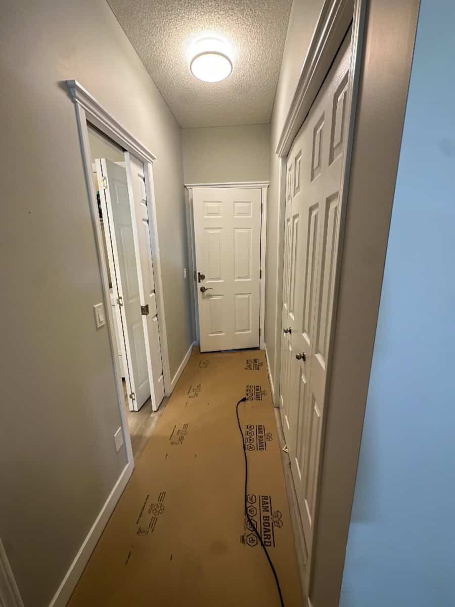 Bruce’s two-story home presented a comprehensive repiping project. The Urban Piping team arrived on September 27th and got to work immediately, starting with thorough site preparation. High-impact Ram Board was laid across all hardwood and tile surfaces to prevent damage, while professional-grade carpet liner protected the traffic areas throughout the home. Light plastic sheeting covered furniture in the work zones and high-traffic areas, ensuring Bruce’s belongings stayed clean and protected throughout the renovation.