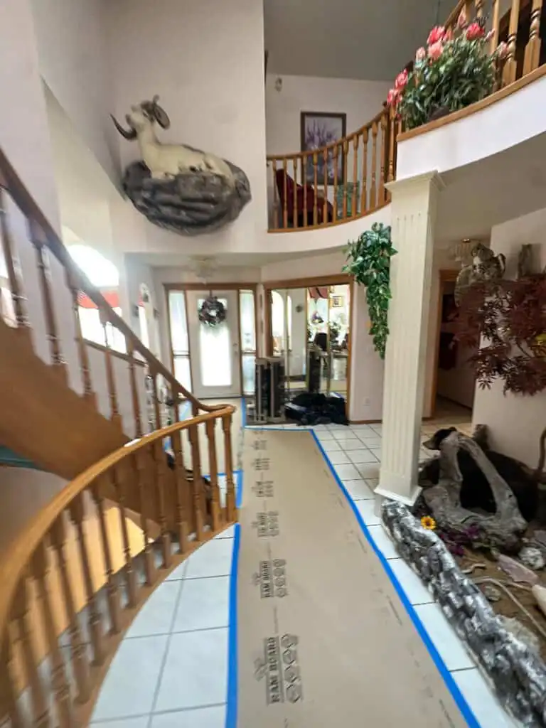The Urban Piping team arrived on September 20th and began with comprehensive site preparation. High-impact Ram Board protected all tile and hardwood surfaces, while professional-grade carpet liner covered every traffic area. Light plastic sheeting draped over furniture in work zones, and the team assisted with moving furniture to ensure complete access to all areas requiring attention. Given the scope of work, Wynn was asked to vacate the home for the first three days while the most intensive phases were completed.
