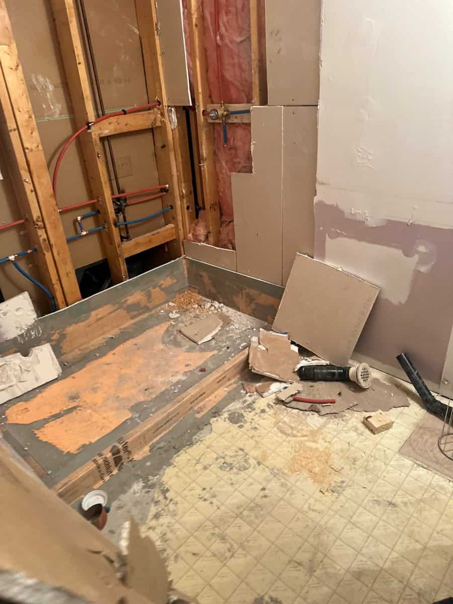 The Poly B replacement scope included complete removal of all polybutylene lines and installation of Rehau Class A PEX with UV barrier protection. Every fixture received new Dahl shut-off valves and braided distribution hoses. With walls already open, the bathroom renovation proceeded seamlessly: a 34×60 Schluter shower base with Delta diverter kit replaced the original shower, complete with RedGard waterproofing and mosaic tile flooring. Custom frameless 8mm glass completed the shower enclosure.